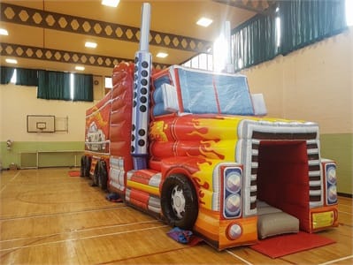 Big Rig inflatable is a magnificent bouncy castle / obstacle in the shape of a stereotypical American truck. Inside are a series of obstacles, biff bash and also a climb wall and a slide.