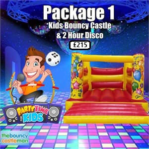 This package includes a 12ft x 12ft castle and a disco for 2 hours. When filling out the booking form remember to add your chosen castle to your booking!